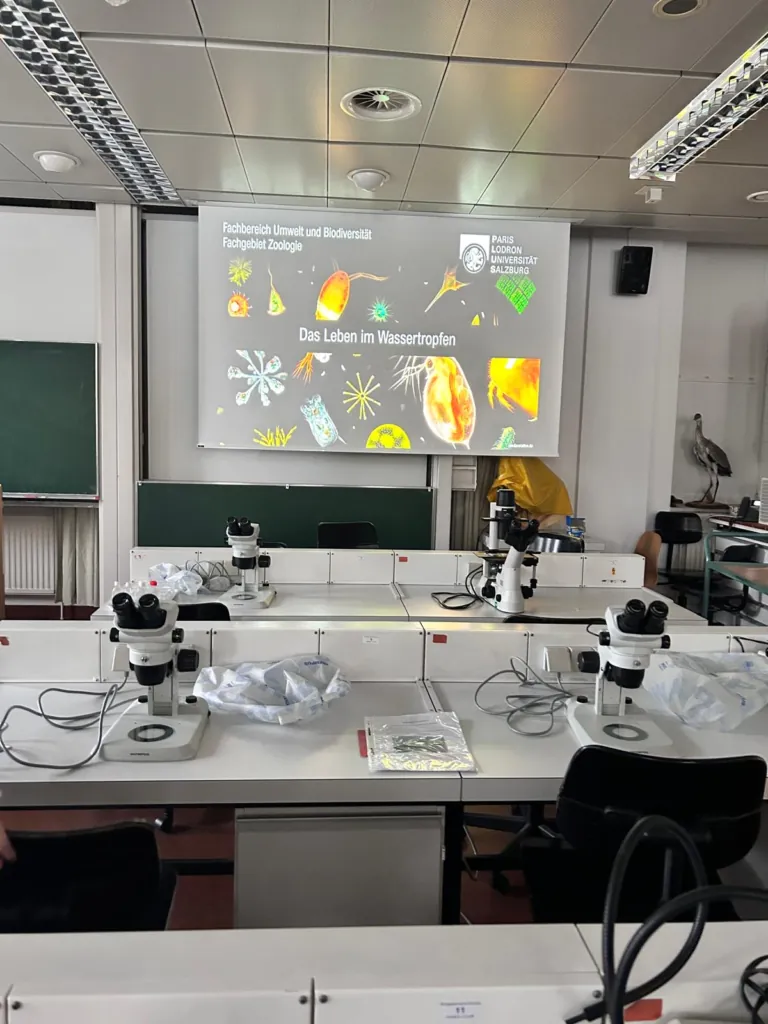 Der erste Programmpunkt war der Besuch der Paris Lodron Universität Salzburg. Dort nahm die Klasse an einer Führung durch ausgewählte Institute teil. Die Schülerinnen und Schüler erhielten einen Überblick über aktuelle Forschungsbereiche in Mathematik und Geologie und Studienmöglichkeiten im naturwissenschaftlichen Bereich. Besonders interessant waren die Workshops zu den Themen „Alpine Massenbewegung“, „Leben im Wassertropfen“, „Elektronenmikroskopie“, „Gesteine mikroskopisch entdecken“ und „Fraktale Welt“. Fragen zum Studium und zum universitären Alltag beantworteten die verantwortlichen Gruppenleiter sehr zugewandt und ausführlich.